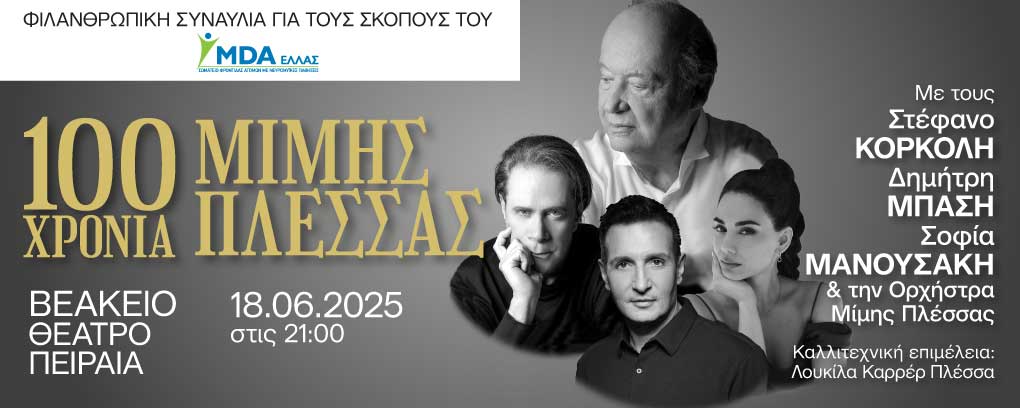Το MDA Ελλάς, Σωματείο για τη φροντίδα των ατόμων με Νευρομυϊκές Παθήσεις παρουσιάζει την Τετάρτη 18 Ιουνίου και ώρα 21.00 στο Βεάκειο Θέατρο Πειραιά, το μουσικό αφιέρωμα «Ο Αιώνας του Μίμη Πλέσσα» με τους Στέφανο Κορκολή, Δημήτρη Μπάση, Σοφία Μανουσάκη & την Ορχήστρα Μίμης Πλέσσας, σε καλλιτεχνική επιμέλεια της Λουκίλας Καρρέρ Πλέσσα.