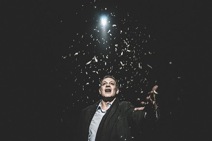 «… Οι φωτισμοί δημιούργησαν εξΆ αρχής μια επιβλητική και υποβλητική ατμόσφαιρα, ενώ η κινησιολογία «κούμπωνε» άψογα με τη ροή του λόγου. Ο εξαιρετικός ερμηνευτής Θ. Σαράντος, κάνοντας «διάλογο» με ένα πιάνο επί σκηνής, καταφέρνει να σε μεταφέρει σε μια αλλοτινή εποχή, χωρίς σκηνικά, με μοναδικά εργαλεία ένα παλτό και μία βαλίτσα.