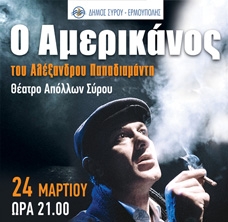 Η εταιρεία Θεάτρου Ηθικόν Ακμαιότατον, σε συνεργασία με τις "Όψεις πολιτισμού", παρουσιάζουν την παράσταση «Ο Αμερικάνος» βασισμένη στο κλασικό διήγημα του Αλέξανδρου Παπαδιαμάντη.