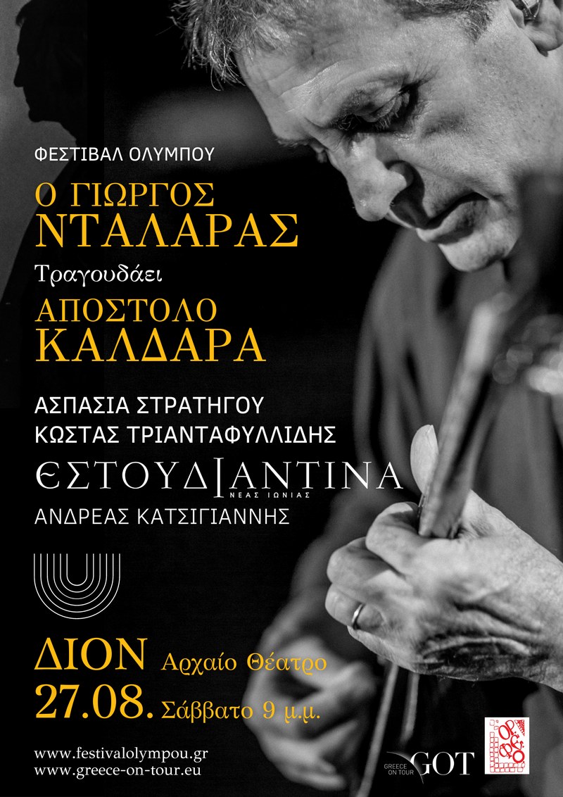 Με μια μεγάλη συναυλία στο Aρχαίο Θέατρο Δίου, το Σάββατο 27 Αυγούστου, ο Γιώργος Νταλάρας θα αποτίνει φόρο τιμής στον μεγάλο λαϊκό συνθέτη και δάσκαλο του, Απόστολο Καλδάρα, διατρέχοντας το έργο του μέσα από τραγούδια-σταθμούς. Στο σπουδαίο αυτό μουσικό αφιέρωμα, το οποίο πραγματοποιείται στο πλαίσιο των εκδηλώσεων του Φεστιβάλ Ολύμπου, με αφορμή τη συμπλήρωση 100 χρόνων από τη Μικρασιατική Καταστροφή και την επέτειο γέννησης του Απόστολου Καλδάρα, θα συμμετέχουν επίσης, η Εστουδιαντίνα Νέας Ιωνίας Βόλου υπό τη διεύθυνση του Ανδρέα Κατσιγιάννη και οι εξαιρετικοί ερμηνευτές Ασπασία Στρατηγού και Κώστας Τριανταφυλλίδης.