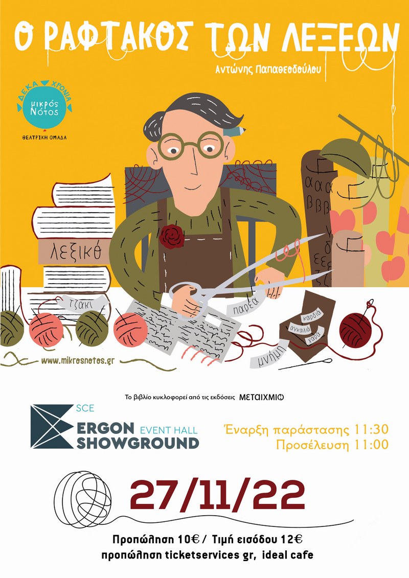 Η θεατρική ομάδα Μικρός Νότος θα ζωντανέψει το βιβλίο του Αντώνη Παπαθεοδούλου «Ο Ραφτάκος των λέξεων», που κυκλοφορεί από τις εκδόσεις ΜΕΤΑΙΧΜΙΟ, σε θεατρική διασκευή της Τίνας Γιωτοπούλου, σκηνοθεσία του Γιώργου Τζαβάρα, πρωτότυπη μουσική του Νίκου Πλατύραχου και καλλιτεχνική επιμέλεια της Χρύσας Διαμαντοπούλου.