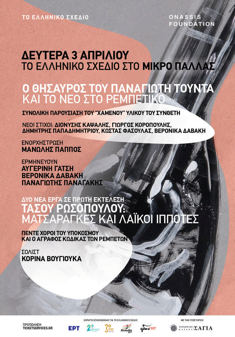Ολοκληρωμένη παρουσίαση των τραγουδιών από τον μουσικό θησαυρό του Παναγιώτη Τούντα Σχέδιο θα πραγματοποιηθεί τη Δευτέρα 3 Απριλίου στο Μικρό Παλλάς στο πλαίσιο του φεστιβάλ ελληνικής μουσικής με σημείο επανεκκίνησης το ρεμπέτικο που σχεδίασε και οργάνωσε Το Ελληνικό Σχέδιο. Μαζί θα παρουσιαστούν σε πρώτη εκτέλεση δύο νέα έργα του συνθέτη Τάσου Ρωσόπουλου, αναθέσεις του Ελληνικού Σχεδίου, οι «Ματσαράγκες, πέντε χοροί του υπόκοσμου για σόλο κιθάρα» με την κιθαρίστα Κορίνα Βουγιούκα και το έργο για μικρό σύνολο «Λαϊκοί Ιππότες», δύο έργα όπου το ρεμπέτικο εμπνέει και επηρεάζει την σύγχρονη μουσική δημιουργία.