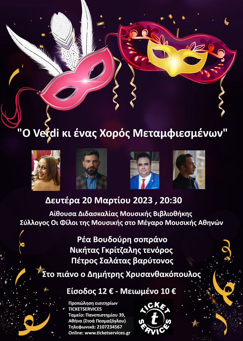 Τη Δευτέρα 20 Μαρτίου 2023 στις 8.30 το βράδυ, τρεις νέοι ταλαντούχοι λυρικοί καλλιτέχνες, η σοπράνο Ρέα Βουδούρη, ο τενόρος Νικήτας Γκρίτζαλης & ο βαρύτονος Πέτρος Σαλάτας, θα φορέσουν τις μάσκες τους και θα σας πάρουν μαζί τους σ' ένα μαγικό ταξίδι στα παλάτια του πρίγκιπα Ρικκάρντο και του Οθέλλου, στα σαλόνια της Βιολέττας Βαλερύ, του Αλφρέντο και του Ζερμόν, και στην αυλή της Ισπανίας του Ντον Κάρλο και των τροβαδούρων, με πλοηγό την υπέροχη μουσική του Τζ. Βέρντι και με τον Δημήτρη Χρυσανθακόπουλο στο πιάνο.