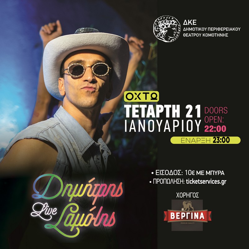 Ο τραγουδοποιός και ηθοποιός Δημήτρης Σαμόλης έρχεται για πρώτη φορά στην Κομοτηνή με την μπάντα του Live στο Οκτώ και φιλοδοξεί να σας πάρει από το χέρι κάνοντας παρέα μέσα από τα τραγούδια του νέου του άλμπουμ «Το έπος του χωρισμού μου θα έπρεπε να διδάσκεται στα σχολεία» αλλά και προηγούμενων τραγουδιών του και απρόσμενων διασκευών. Διότι τα πατώματα όταν το παρκέ είναι σφουγγαρισμένο από δάκρυα είναι η ιδανική μουσική σκηνή.