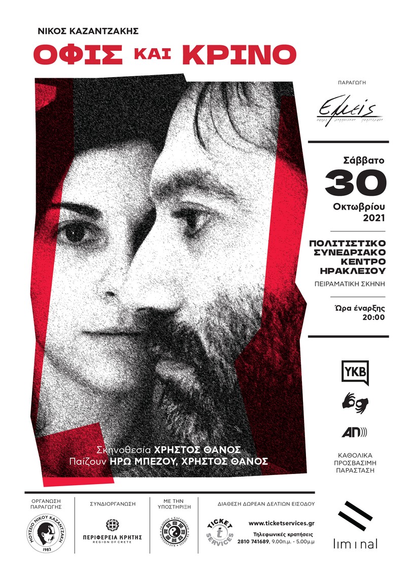 Το Μουσείο Καζαντζάκη και η Περιφέρεια Κρήτης, με την ευγενική υποστήριξη των Εκδόσεων Καζαντζάκη, παρουσιάζουν την παράσταση «Όφις και Κρίνο» στην Πειραματική Σκηνή του Πολιτιστικού και Συνεδριακού Κέντρου Ηρακλείου, το Σάββατο 30 Οκτωβρίου 2021, και ώρα 8.00 μ.μ. Η παράσταση είναι καθολικά προσβάσιμη, περιλαμβάνοντας ακουστική περιγραφή για άτομα με οπτική αναπηρία, υπέρτιτλους και νοηματική διερμηνεία για κωφούς και βαρήκοους.
