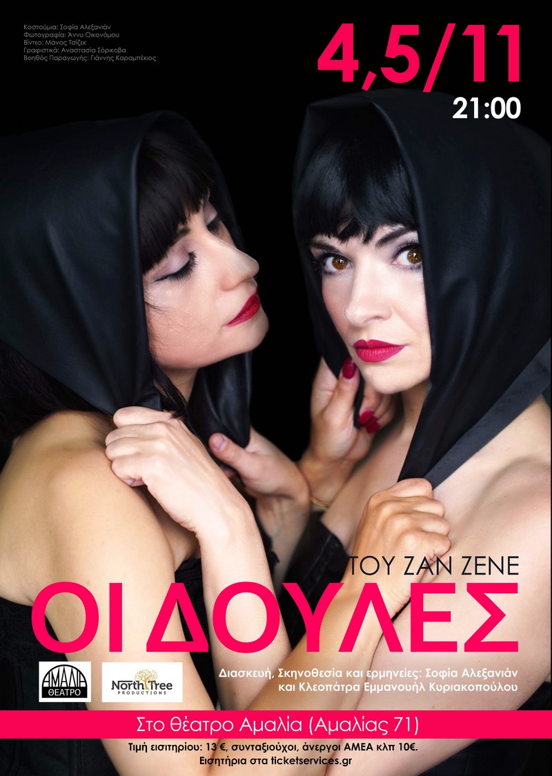 Για το έργο: Οι δούλες (Les Bonnes) είναι μονόπρακτο θεατρικό δράμα του Γάλλου λογοτέχνη, Ζαν Ζενέ που γράφτηκε το 1947. Ο συγγραφέας εμπνεύστηκε το έργο, από το διαβόητο έγκλημα των αδερφών Παπέν που διαπράχθηκε το 1933. Εξερευνά και παρουσιάζει τις σχέσεις εξουσιαστή - εξουσιαζόμενου στους κοινωνικούς ρόλους των ανθρώπων. Το έργο θεωρείται από τα καλύτερα της σύγχρονης δραματουργίας αφού ο Ζενέ κατόρθωσε να συγκεράσει με θαυμαστό τρόπο της τεχνικές του θεάτρου μέσα στο θέατρο με την πολιτική σάτιρα, σε ένα υποβλητικό και γεμάτο συμβολισμούς σκηνικό με όλες τις μεθόδους του θεάτρου παραλόγου τόσο στον διάλογο όσο και στην κίνηση των ηθοποιών.