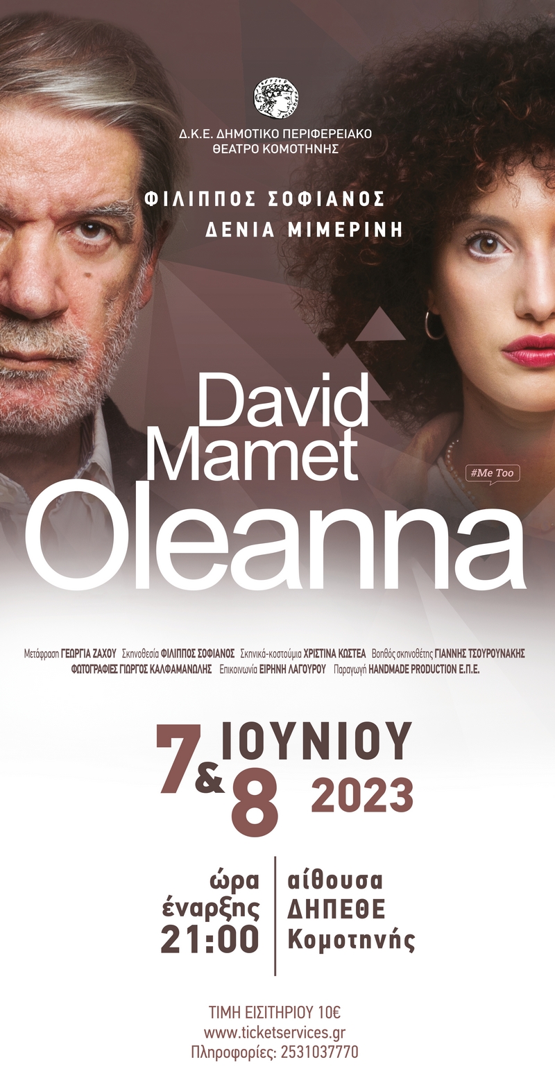 Η Δημοτική Κοινωφελής Επιχείρηση Δημοτικού Περιφερειακού Θεάτρου Κομοτηνής φιλοξενεί στην σκηνή της, την παράσταση με το έργο του Ντέιβιντ Μάμετ «Ολεάννα».
