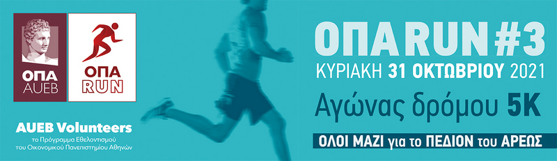 Το Οικονομικό Πανεπιστήμιο Αθηνών και η Περιφέρεια Αττικής συνδιοργανώνουν για 3η χρονιά το "ΟΠΑ Run", Αγώνα Δρόμου 5 χλμ, που θα διεξαχθεί την Κυριακή 31 Οκτωβρίου 2021 στο Πεδίον του Άρεως. Ο αγώνας τελεί υπό την αιγίδα του Δήμου Αθηναίων και πραγματοποιείται με την υποστήριξη του Οργανισμού Πολιτισμού, Αθλητισμού και Νεολαίας του Δήμου Αθηναίων (ΟΠΑΝΔΑ) και του Πανελληνίου Γυμναστικού Συλλόγου. Το 3ο ΟΠΑ Run εντάσσεται στην στρατηγική κοινωνικής προσφοράς του ΟΠΑ ως δράση του Προγράμματος Εθελοντισμού "AUEB Volunteers" , καθώς η οργανωτική του ομάδα αποτελείται κυρίως από φοιτήτριες και φοιτητές του Πανεπιστημίου.