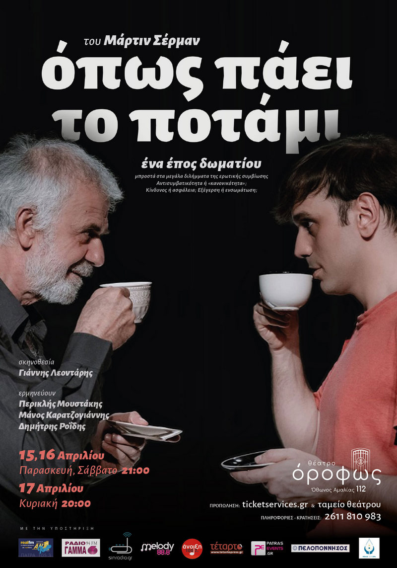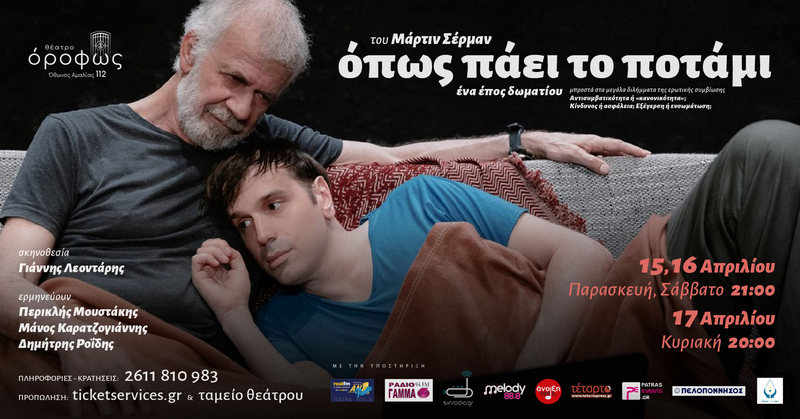 Ένα παράδοξο στοίχημα: να χωρέσεις σε ένα θεατρικό έργο δωματίου μία επική αφήγηση και μία ερωτική εξομολόγηση. Αυτό καταφέρνει με δεξιοτεχνία, χιούμορ και τρυφερότητα ο Μάρτιν Σέρμαν στο «Όπως πάει το ποτάμι», το πιο πρόσφατο και πιο προσωπικό από τα έργα του. Από τη μία, η «εποποιία» των διεκδικήσεων της gay κοινότητας για σεβασμό στη διαφορετικότητα και ίσα δικαιώματα. Από την άλλη, η τρυφερή όσο και σπαρακτική εξομολόγηση για τη φθορά του γήρατος και τον ερωτικό πόθο. Μια ιστορική αναδρομή με συνταρακτικά ντοκουμέντα μέσα από τη θυελλώδη ερωτική ιστορία δύο ανδρών με μεγάλη διαφορά ηλικίας μεταξύ τους, η οποία εκτυλίσσεται εξολοκλήρου στο καθιστικό του κοινού τους σπιτιού κατά τη διάρκεια δεκατεσσάρων χρόνων.