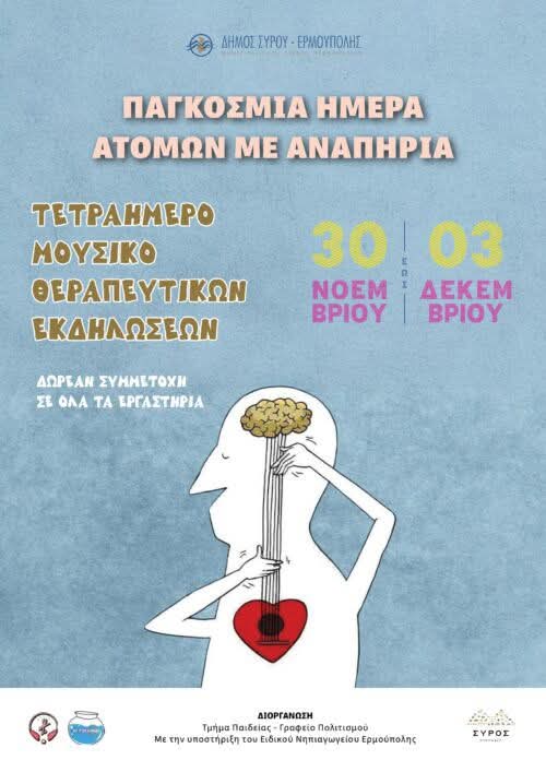 Ο Δήμος Σύρου-Ερμούπολης, στο πλαίσιο της Παγκόσμιας Ημέρας Ατόμων με Αναπηρία (3 Δεκεμβρίου), διοργανώνει ένα ξεχωριστό τετραήμερο μουσικοθεραπευτικών εκδηλώσεων για παιδιά με ειδικές εκπαιδευτικές ανάγκες, με στόχο την ενίσχυση της κοινωνικής ευαισθητοποίησης, την προώθηση της ένταξης και την ανάδειξη της μουσικής ως εργαλείου επικοινωνίας και θεραπείας.