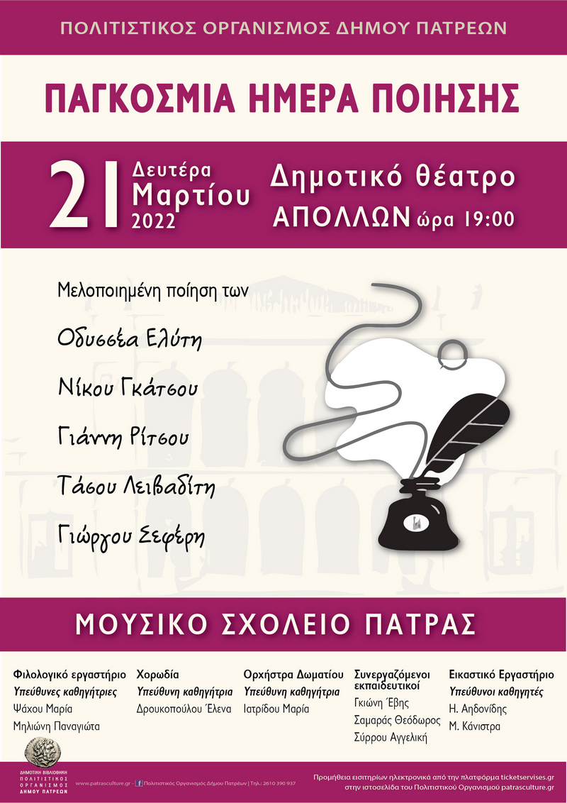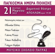 Ο Πολιτιστικόs Οργανισμόs του Δήμου Πατρέων, με αφορμή την παγκόσμια Ημέρα Ποίησης, σε συνεργασία με το Μουσικό Σχολείο Πάτρας, οργανώνει εκδήλωση με τίτλο «Ποίηση για την Ποίηση».