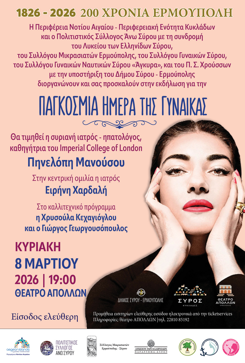 Η Περιφέρεια Νοτίου Αιγαίου - Περιφερειακή Ενότητα Κυκλάδων και ο Πολιτιστικός Σύλλογος Άνω Σύρου με τη συνδρομή του Λυκείου των Ελληνίδων Σύρου, του Συλλόγου Μικρασιατών Ερμούπολης, του Συλλόγου Γυναικών Σύρου, του Συλλόγου Γυναικών Ναυτικών Σύρου «Άγκυρα», και του Π. Σ. Χρούσσων με την υποστήριξη του Δήμου Σύρου - Ερμούπολης διοργανώνουν και σας προσκαλούν στην εκδήλωση για την Παγκόσμια Ημέρα της Γυναίκας.