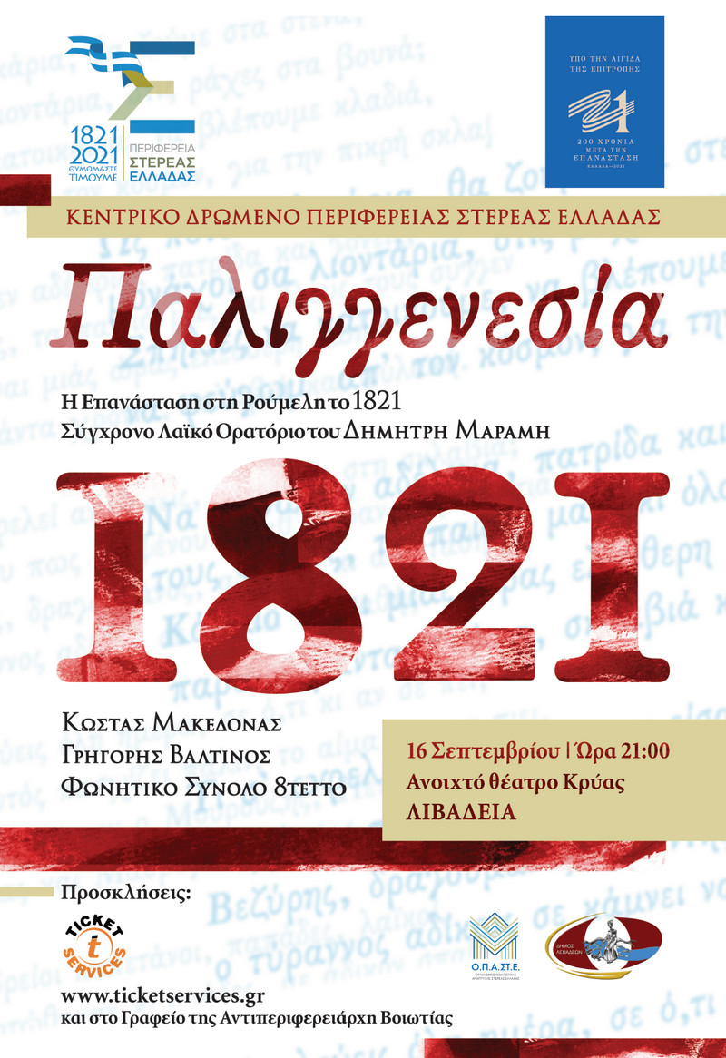 Το λαϊκό ορατόριο «Παλιγγενεσία», ανάθεση της Περιφέρειας Στερεάς Ελλάδας στον συνθέτη Δημήτρη Μαραμή, το οποίο ερμηνεύουν ο Κώστας Μακεδόνας, o Γρηγόρης Βαλτινός και το φωνητικό σύνολο «8tetto», θα αποτελέσει το κεντρικό δρώμενο της Περιφέρειας Στερεάς Ελλάδας για τον εορτασμό των 200 χρόνων από την Ελληνική Επανάσταση.