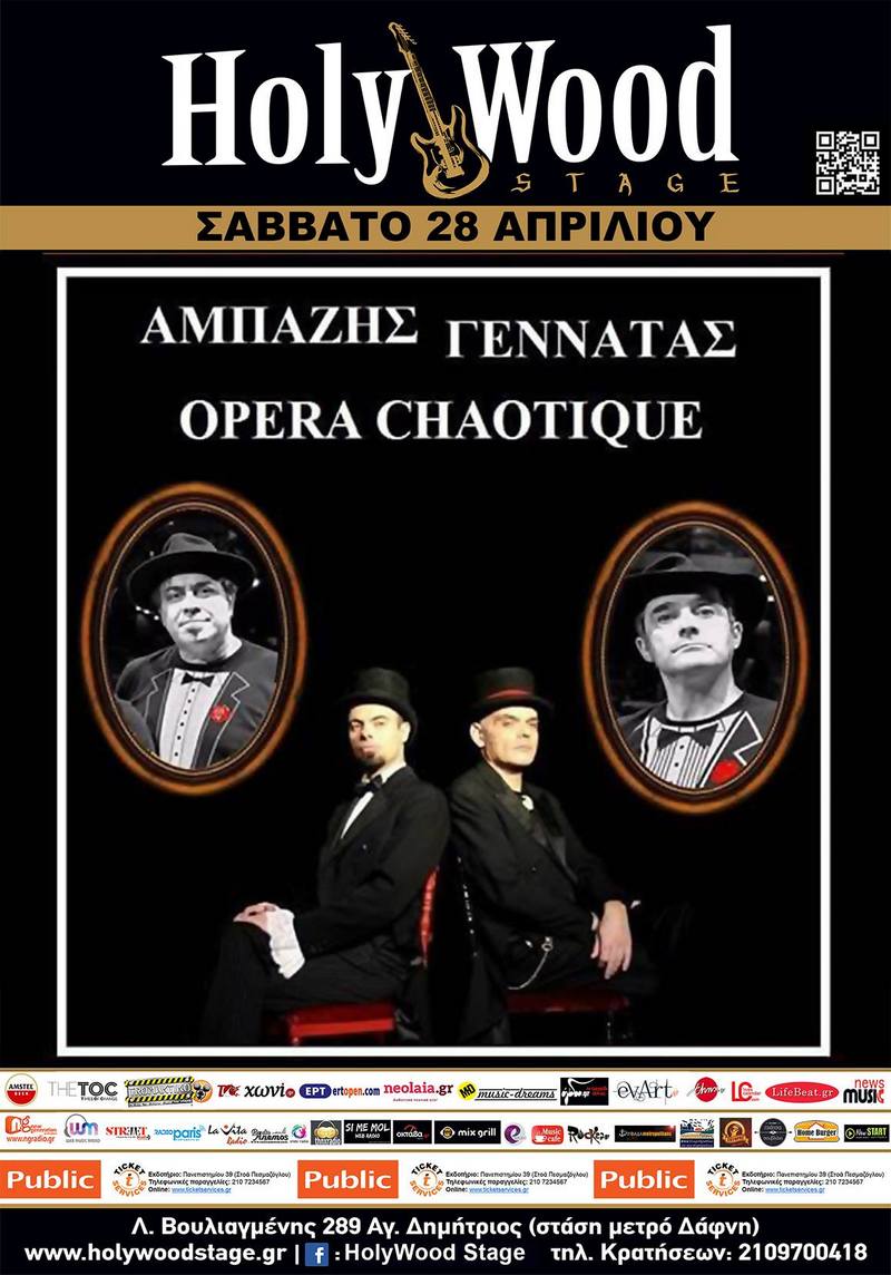 Κάθε τους συναυλία είναι μια ανεπανάληπτη μουσική εμπειρία, ένα σουρεαλιστικό ταξίδι σε τόπους κι εποχές όπου όλα είναι πιθανά. Οι Opera Chaotique ένα εκκεντρικό ντουέτο με αναπάντεχα ανατρεπτικό χιούμορ και άκρως σουρεαλιστική φαντασία, έχουν εμφανιστεί σε όλη την Ευρώπη σε σημαντικά φεστιβάλ και hotspots.
