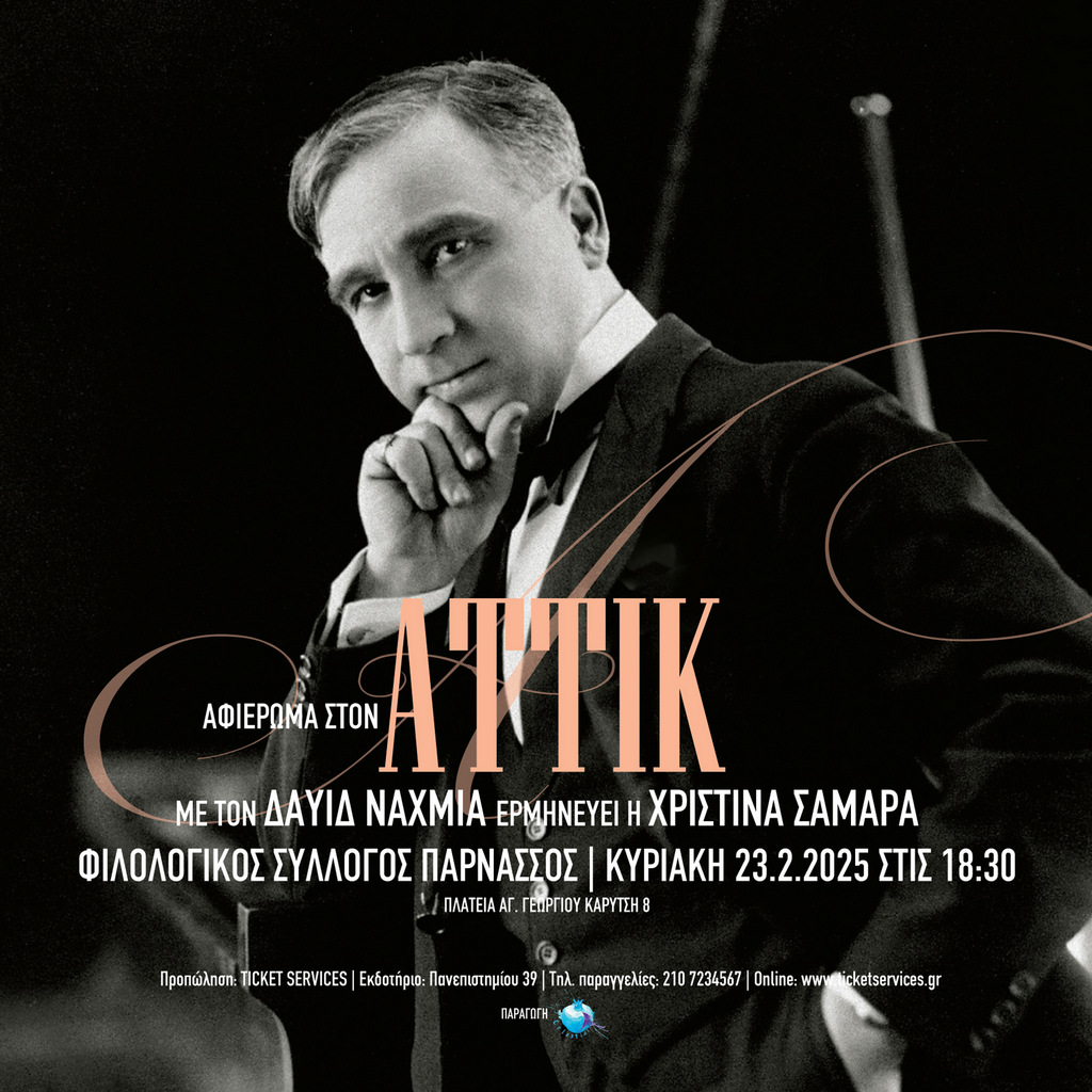 Τον θυμόμαστε μέσα από μια αξέχαστη παράσταση με τα υπέροχα τραγούδια του... Ζητάτε να σας πω, Τα τελευταία γιασεμιά, Τα μαραμένα γιούλια, Τα καημένα τα νιάτα και πολλά άλλα, μοναδικά ερμηνευμένα απ' την Χριστίνα Σαμαρά. Αττίκ, ο άνθρωπος του μεγαλείου και της πτώσης. Ο αλχημιστής που μετέτρεψε τον προσωπικό του πόνο σε συλλογικό τραγούδι. Μία παράσταση του Δαυίδ Ναχμία.