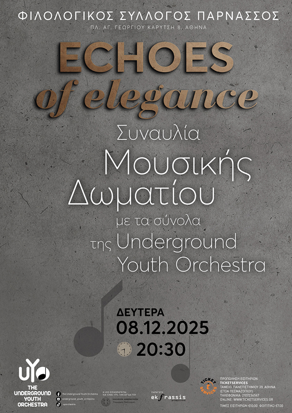 Η Underground Youth Orchestra παρουσιάζει τη συναυλία μουσικής δωματίου "Echoes of Elegance" τη Δευτέρα 8 Δεκεμβρίου 2025, στις 20:30, στον ιστορικό Φιλολογικό Σύλλογο Παρνασσός. Στο πρώτο μέρος, σύνολα πνευστών υπό την καθοδήγηση του Κώστα Γιοβάνη ερμηνεύουν έργα των Danzi, Reicha και Ibert, αναδεικνύοντας το εύρος, την εκφραστικότητα και τη μοναδική ηχητική παλέτα του κουιντέτου και του οκτέτου πνευστών μέσα από κλασικές και μοντέρνες προσεγγίσεις.