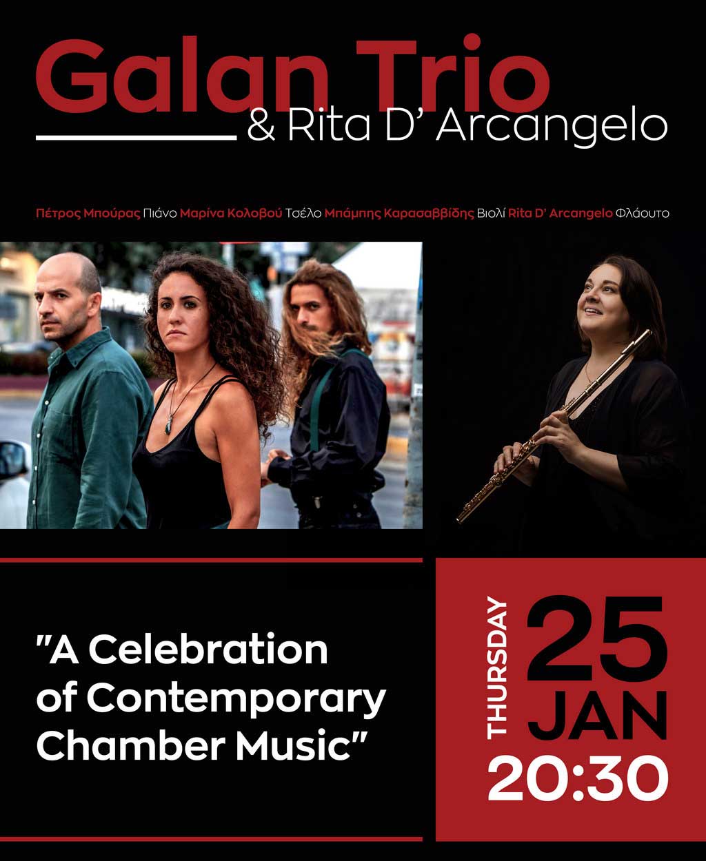 Έπειτα από εμφανίσεις σε Κίνα, Ευρώπη και τέσσερις περιοδείες στις Ηνωμένες Πολιτείες, το Galan Trio επεκτείνει τη διεθνή του πορεία με ένα νέο project, αυτή τη φορά σε συνεργασία με την διακεκριμένη Ιταλίδα φλαουτίστα Rita D 'Arcangelo.