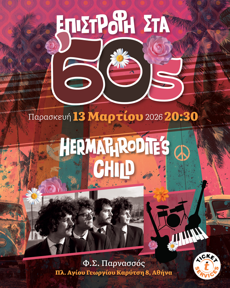 Η συναυλία «Επιστροφή στα 60s» φέρνει στη σκηνή του Φιλολογικού Συλλόγου Παρνασσός τον ήχο, το ύφος και την ατμόσφαιρα της δεκαετίας που σημάδεψε τη σύγχρονη μουσική. Με αναφορές στο surf και beat κύμα των 60s, το πρόγραμμα περιλαμβάνει εμβληματικά τραγούδια των Beach Boys, των Beatles και άλλων χαρακτηριστικών εκπροσώπων της εποχής.