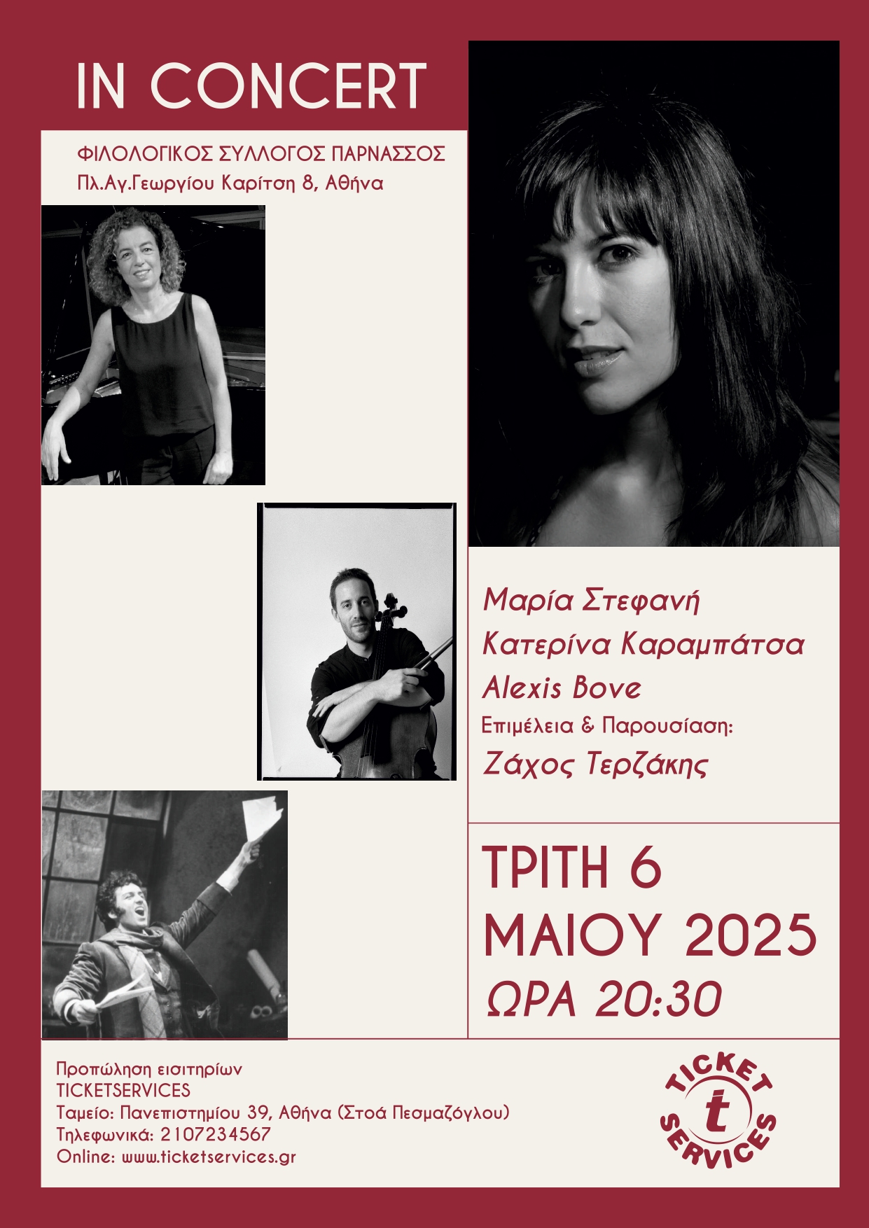 Στη σκηνή μαζί τους συμπράττουν η Κατερίνα Καραμπάτσα στο πιάνο και ο Alexis Bove στο βιολοντσέλλο.