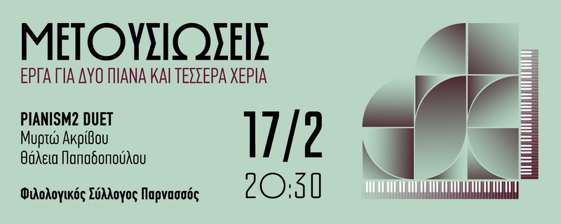 Το Pianism2 duet, αποτελούμενο από τις πιανίστριες Μυρτώ Ακρίβου και Θάλεια Παπαδοπούλου, παρουσιάζει το πρόγραμμα «Μετουσιώσεις», μια συναυλία με έργα που αναδεικνύουν τη δημιουργική δύναμη της μεταγραφής και της ηχητικής μεταμόρφωσης.