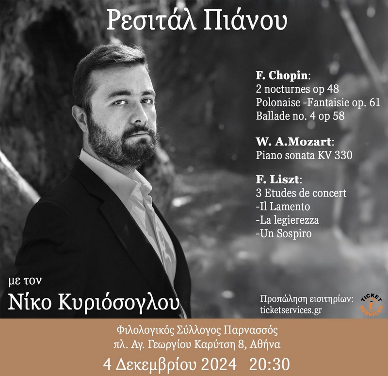 Ο διακεκριμένος πιανίστας Νίκος Κυριόσογλου επιστρέφει στον Φιλολογικό Σύλλογο Παρνασσόw, με ένα ρεσιτάλ πιάνου σε δημοφιλή έργα του πιανιστικού ρεπερτορίου εστιασμένο σε ρομαντικές και δεξιοτεχνικές αφηγήσεις έργων F. Liszt, F. Chopin και W.A. Mozart.