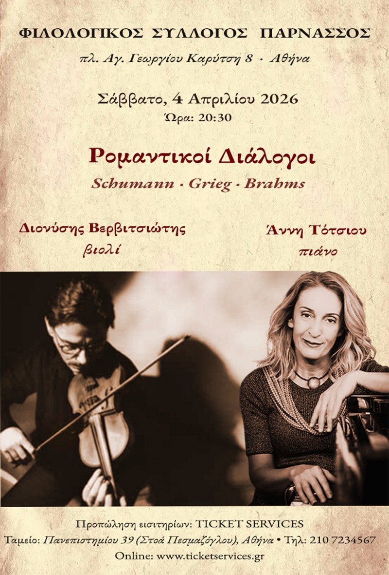 Ο βιολιστής Διονύσης Βαρβιτσιώτης και η πιανίστα Άννη Τότσιου θα ερμηνεύσουν τρεις αγαπημένες σονάτες για βιολί και πιάνο της ρομαντικής περιόδου.
