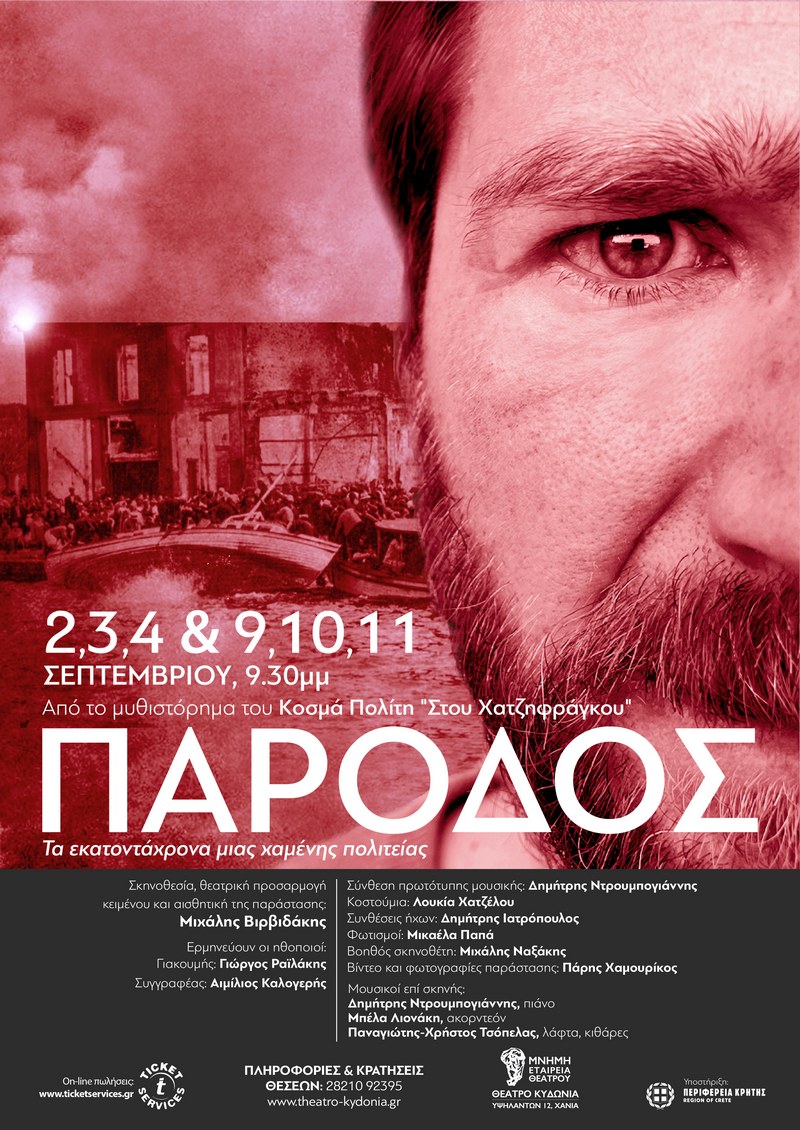 Η Εταιρεία Θεάτρου ΜΝΗΜΗ με αφορμή τη συμπλήρωση 100 χρόνων από τη Μικρασιατική Καταστροφή, επιστρέφει στην ατμόσφαιρα εκείνων των ημερών μέσα από την αριστουργηματική ΠΑΡΟΔΟ του Κοσμά Πολίτη, κεφάλαιο που παρεμβάλλεται στη μέση του εμβληματικού μυθιστορήματός του «Στου Χατζηφράγκου» και μας «εισάγει» στη μεγαλύτερη τραγωδία που βίωσε ο ελληνισμός από γενέσεως ελληνικού κράτους. Η λογοτεχνική αξία του είναι απαράμιλλη καθώς καταφέρνει να λειτουργήσει στη φαντασία μας τόσο μεταφορικά, σε σχέση με την αξία και την ομορφιά ενός τόπου, όσο και κυριολεκτικά, μεταφέροντάς μας στο επίκεντρο της τραγωδίας που εκτυλίχθηκε τις τελευταίες μέρες του Αυγούστου του '22 στην προκυμαία της Σμύρνης. Η θεατρική παραγωγή συνδυάζεται με πρωτότυπη μουσική του πιανίστα-συνθέτη Δημήτρη Ντρουμπογιάννη, που θα εκτελεστεί ζωντανά επί σκηνής από τρεις μουσικούς και συνοδεύεται από πρόγραμμα με κείμενο της καθηγήτριας Νεοελληνικής Φιλολογίας του Πανεπιστημίου Κρήτης, Αγγέλας Καστρινάκη, που γράφτηκε ειδικά για τις ανάγκες της παράστασης.