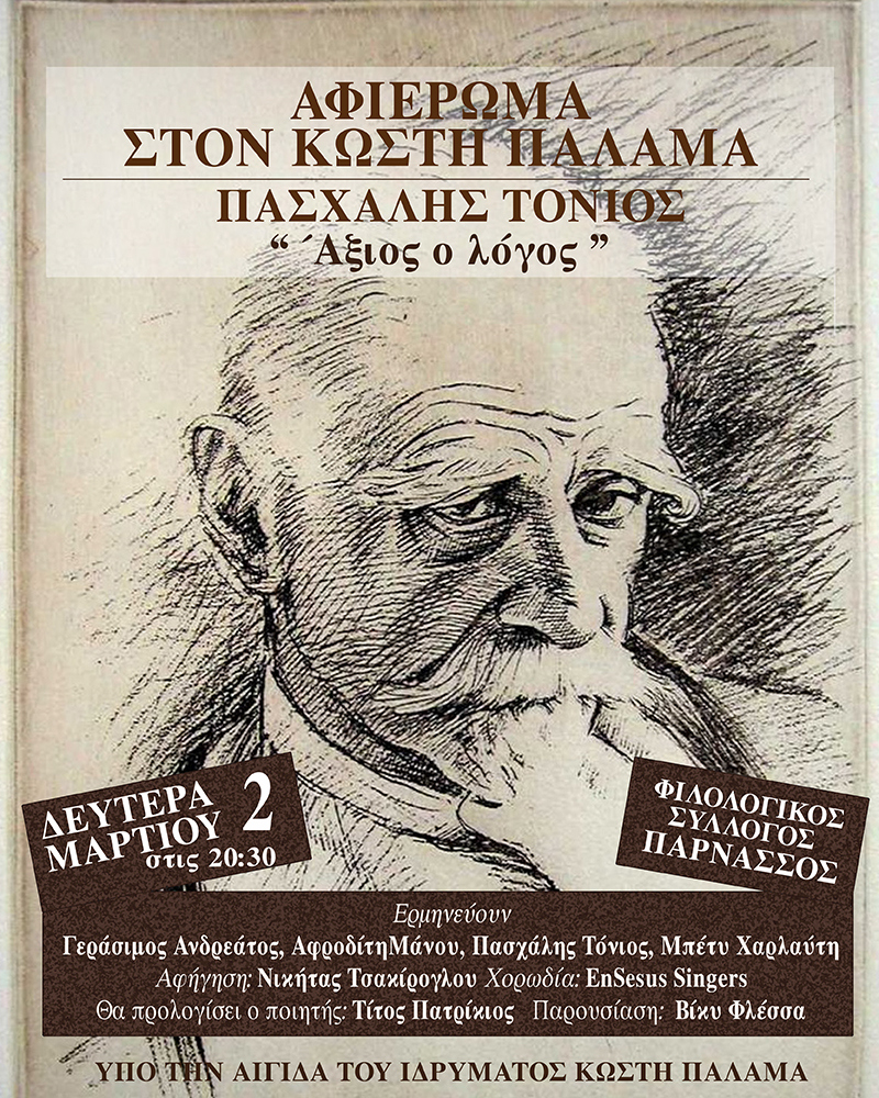 Η εκδήλωση τελεί υπό την αιγίδα του Ιδρύματος Κωστή Παλαμά.