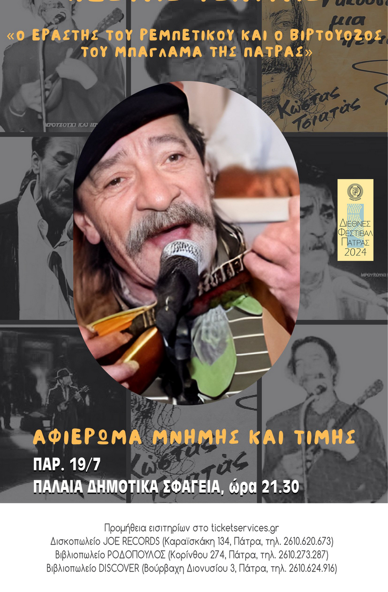 Ο Δήμος Πάτρας και η Αντιδημαρχία Πολιτισμού τιμά την προσφορά και την καλλιτεχνική προσωπικότητα του Κώστα Τσιατά στην αναβίωση του ρεμπέτικου και στα πολιτιστικά δρώμενα της Πάτρας. Πραγματοποιεί ειδικό αφιέρωμα-συναυλία την Παρασκευή 19 Ιουλίου 2024, στα Παλαιά Σφαγεία Πατρών, ώρα 9:30 το βράδυ, με τη συμμετοχή πολυμελούς εξαιρετικής ορχήστρας.