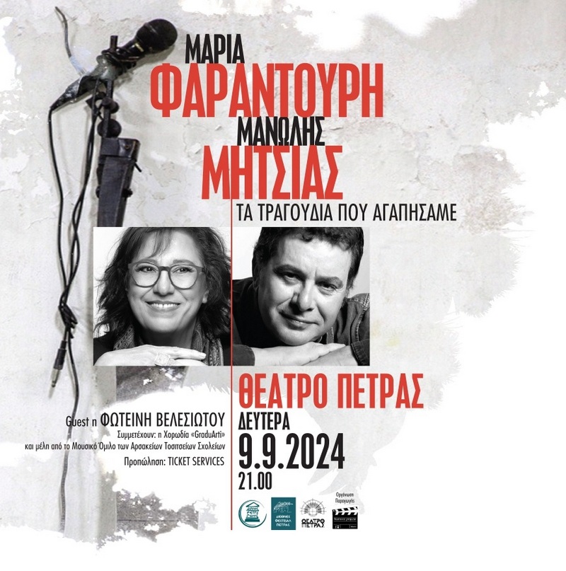 Η Μαρία Φαραντούρη και ο Μανώλης Μητσιάς, δύο καταξιωμένοι ερμηνευτές που συνεργάστηκαν με όλους τους μεγάλους συνθέτες και τραγούδησαν τον λόγο των ποιητών και τους καημούς των ανθρώπων, ενώνουν τις φωνές τους και μας καλούν σε μια πανηγυρική συναυλία στο Θέατρο Πέτρας «πριν έμπει το φθινόπωρο πριν βγει το καλοκαίρι», όπως λέει ένας στίχος του Γκάτσου.