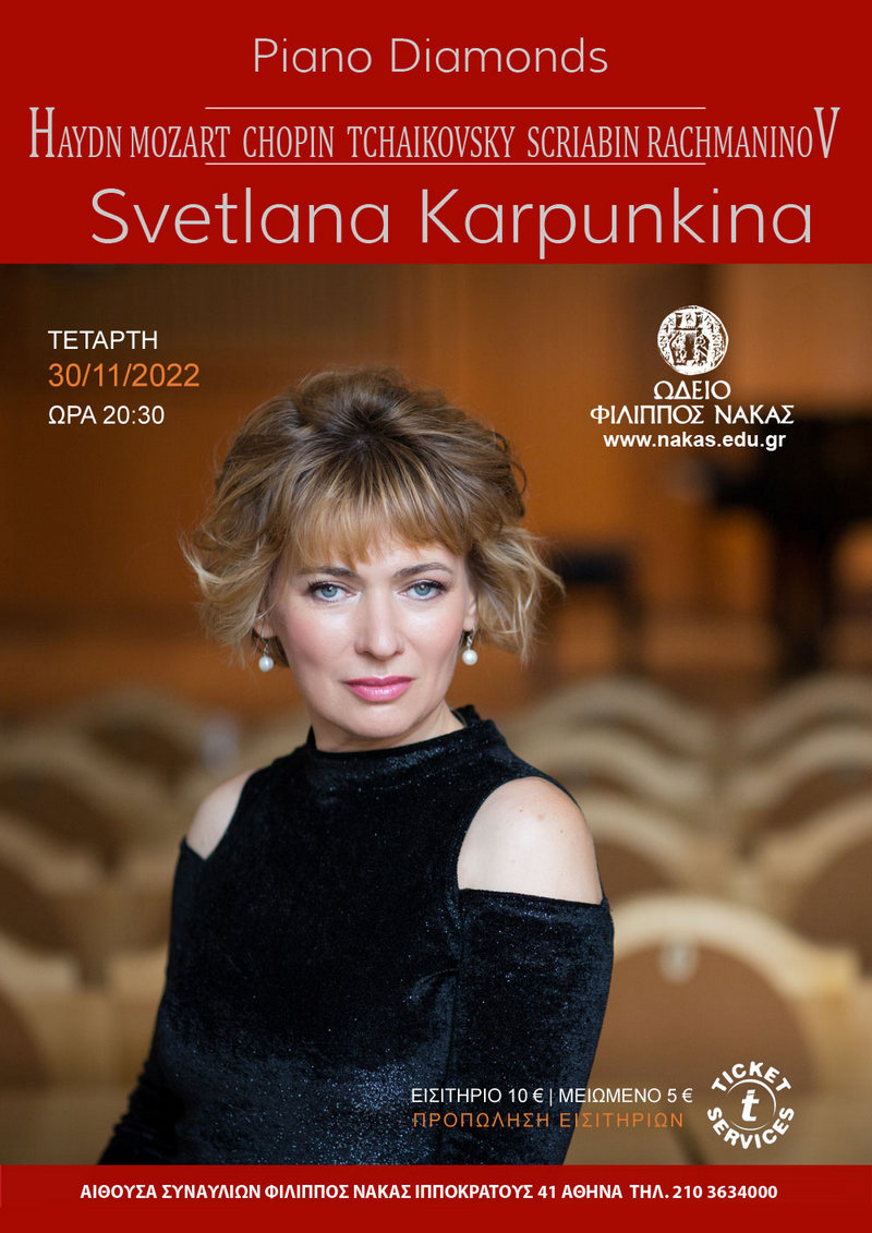 Έργα γεμάτα λυρισμό και δύναμη, έργα-διαμάντια της πιανιστικής φιλολογίας θα ακούσουμε στο ρεσιτάλ της Svetlana Karpunkina την Τετάρτη 30 Νοεμβρίου στην Αίθουσα Συναυλιών Φίλιππος Νάκας. Πρόκειται για ένα πρόγραμμα που εκφράζει απόλυτα την ερμηνεύτρια και "αγγίζει" την ψυχή της.
