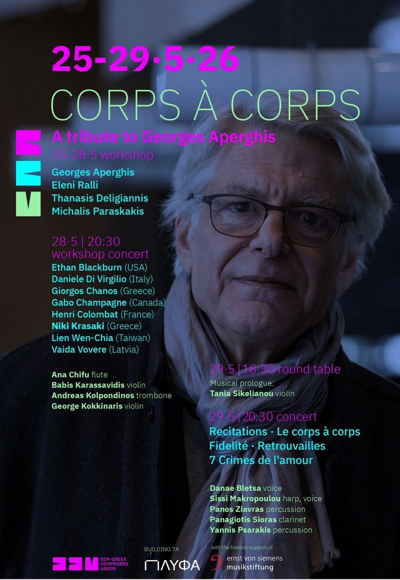 To celebrate Georges Aperghis' 80th birthday, the Greek Composers' Union presents a tribute to his work and a music theatre workshop. The composer will be with us in person for a round table two final concerts: the first concert showcasing the workshop participants, the second concert featuring his own music-theatre works. The event will conclude with the Union naming him Honorary President.