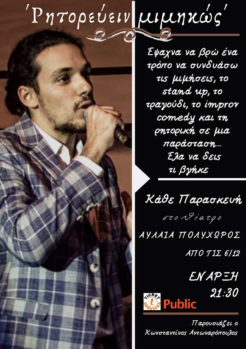 Από τις 7 Φεβρουαρίου 2020 θα φιλοξενήσει τον Κωνσταντίνο Αντωναρόπουλο, όπου μετά την παρουσίασή του σε παραστάσεις στη μουσική σκηνή "café 135" επανέρχεται δυναμικά με την ολοκαίνουργια solo stand up comedy παράστασή του με τίτλο "Ρητορεύειν Μιμηκώς"!