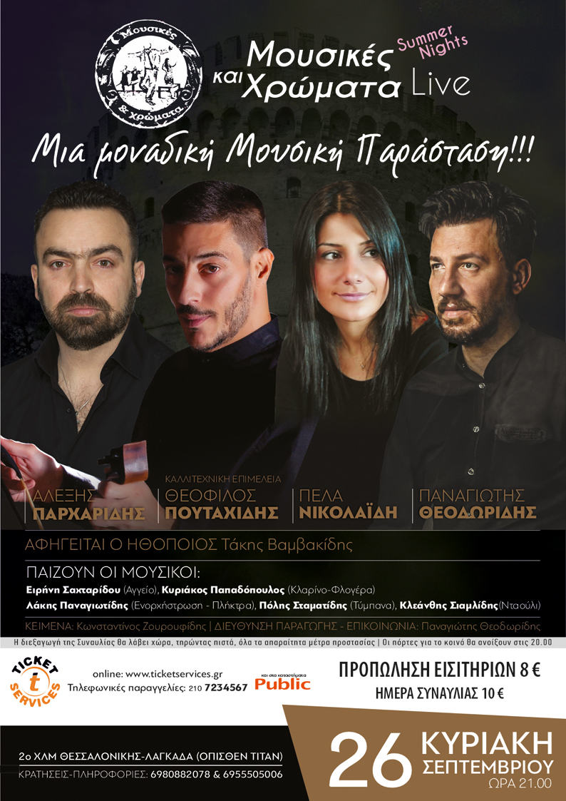 Ο Αλέξης Παρχαρίδης, ο Θεόφιλος Πουταχίδης, ο Παναγιώτης Θεοδωρίδης και η Πέλα Νικολαϊδου, έρχονται την Κυριακή 26 Σεπτεμβρίου 2021, στις 9 το βράδυ, για μια μοναδική Μουσική Παράσταση στη Θεσσαλονίκη, στον πολυχώρο Μουσικές & Χρώματα LIVE Summer, όπισθεν του ΤΙΤΑΝ.