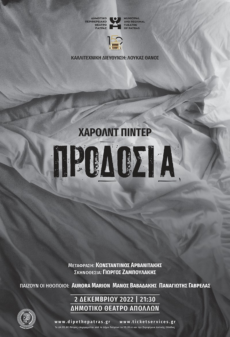 Την Προδοσία επέλεξε το ΔΗ.ΠΕ.ΘΕ. Πάτρας για την Κεντρική του Σκηνή , σε νέα μετάφραση του Κωνσταντίνου Αρβανιτάκη και σκηνοθεσία Γιώργου Ζαμπουλάκη, που ξεκίνησε τις παραστάσεις του την Παρασκευή 2 Δεκεμβρίου 2022 και έχει προγραμματίσει την επίσημη πρεμιέρα για την Παρασκευή 9 Δεκεμβρίου 2022 στο Δημοτικό Θέατρο Απόλλων.