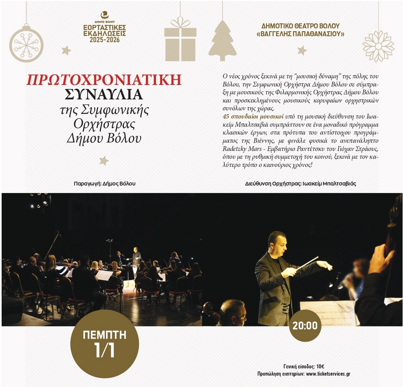 Ο νέος χρόνος ξεκινά με τη "μουσική δύναμη" της πόλης του Βόλου, την Συμφωνική Ορχήστρα Δήμου Βόλου σε σύμπραξη με μουσικούς της Φιλαρμονικής Ορχήστρας Δήμου Βόλου και προσκεκλημένους μουσικούς κορυφαίων ορχηστρικών συνόλων της χώρας. 45 σπουδαίοι μουσικοί υπό τη μουσική διεύθυνση του Ιωακείμ Μπαλτσαβιά συμπράττουν σε ένα μοναδικό πρόγραμμα κλασικών έργων, στα πρότυπα του αντίστοιχου προγράμματος της Βιέννης, με φινάλε φυσικά το ανεπανάληπτο Radetzky Mars - Εμβατήριο Ραντέτσκυ του Γιόχαν Στράους, όπου με τη ρυθμική συμμετοχή του κοινού, ξεκινά με τον καλύτερο τρόπο ο καινούριος χρόνος!