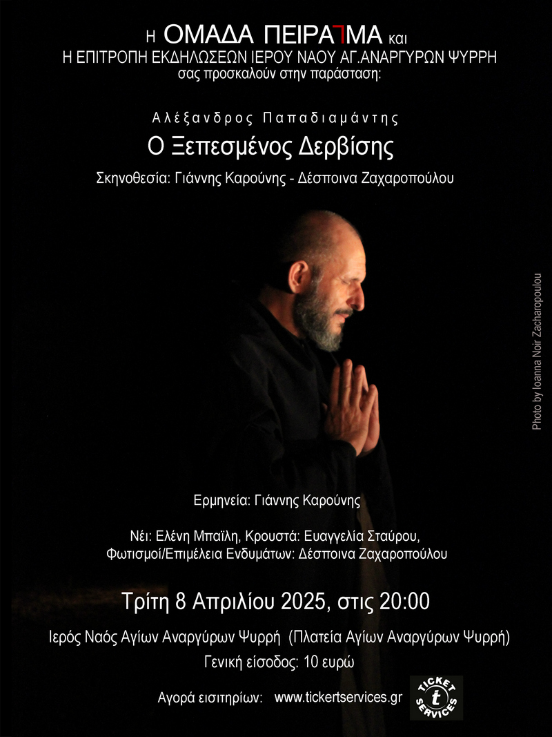 Ο τρόπος που προσεγγίσαμε τη θεατρική απόδοση του διηγήματος του Αλέξανδρου Παπαδιαμάντη, «Ο Ξεπεσμένος Δερβίσης,» βασίστηκε κυρίως στην τοποθέτηση σε πρώτο πλάνο της γλώσσας του συγγραφέα, σε μια προσπάθεια να την επαναφέρουμε στο σήμερα, σεβόμενοι τους ιδιωματισμούς, την ατμόσφαιρα και τον ρυθμό στον οποίο μας εισάγει. Για αυτό τον λόγο, αποφασίσαμε να απογυμνώσουμε τον σκηνικό χώρο στα ελάχιστα μέσα, χρησιμοποιώντας φυσικό ήχο στη φωνή και στα μουσικά όργανα. Στόχος μας είναι, ο θεατής να βγει από την ταχύτητα που χαρακτηρίζει την καθημερινότητά του και να εισέλθει σε έναν άλλο χρόνο, έναν άλλο ρυθμό, μια άλλη δόνηση.