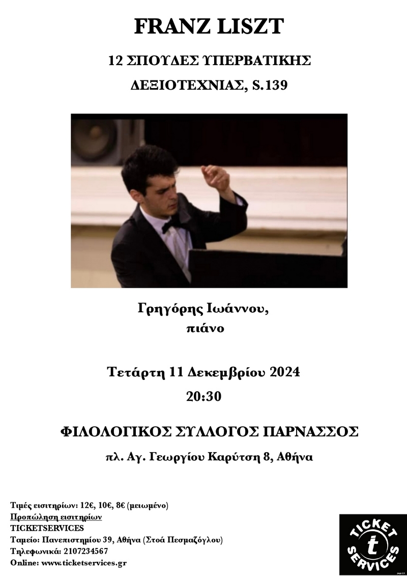 Ο διακεκριμένος πιανίστας Γρηγόρης Ιωάννου, βραβευμένος μεταξύ άλλων και στον διεθνή διαγωνισμό Franz Liszt της Βαϊμάρης, παρουσιάζει τις 12 Σπουδές Υπερβατικής Δεξιοτεχνίας του Ούγγρου βιρτουόζου πιανίστα και συνθέτη.