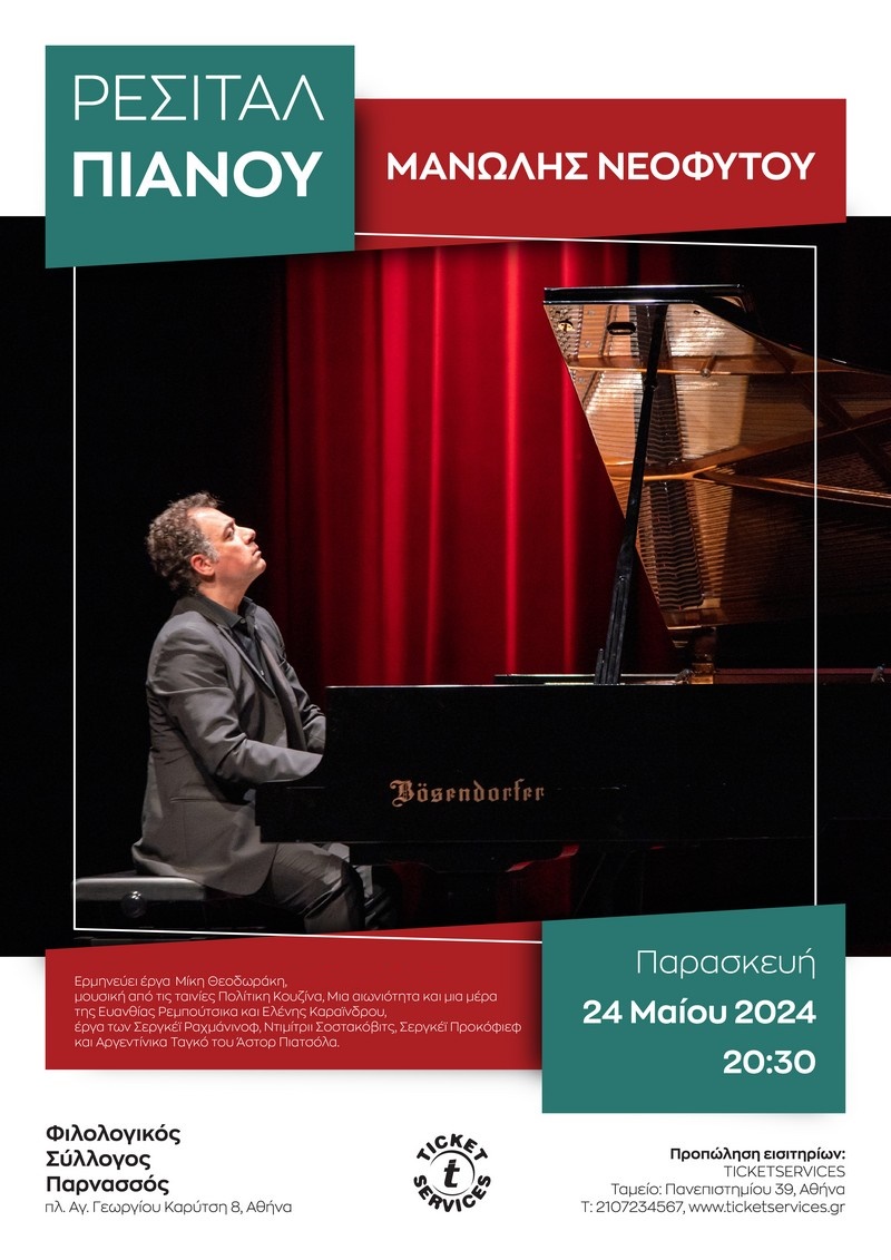 -παρουσιάζει για πρώτη φορά στην Αθήνα, στην κεντρική αίθουσα του Φιλολογικού Συλλόγου Παρνασσός, ένα ρεσιτάλ πιάνου