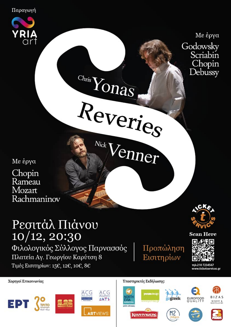 Η YRIART εγκαινιάζει τη σειρά συναυλιών "Κλασικές και Σύγχρονες Δημιουργίες" με ένα διπλό ρεσιτάλ πιάνου από τους διακεκριμμένους πιανίστες Νίκο Βέννερ και Χρήστο Γιώνα, στον ιστορικό χώρο του Φιλολογικού Συλλόγου "Παρνασσός". Το πρόγραμμα περιλαμβάνει έργα των Frédéric François Chopin, Wolfgang Amadeus Mozart, Alexander Scriabin, Sergei Rachmaninoff, Jean-Philippe Rameau και Claude Debussy, προσφέροντας μια πλούσια αναδρομή στη προκλασική, ρομαντική και μετα-ρομαντική μουσική. Αυτή η συναυλία σηματοδοτεί την έναρξη μιας σειράς μουσικών συναυλιών με στόχο την ανάδειξη εξαίρετων νέων και ανερχόμενων ελλήνων καλλιτεχνών.