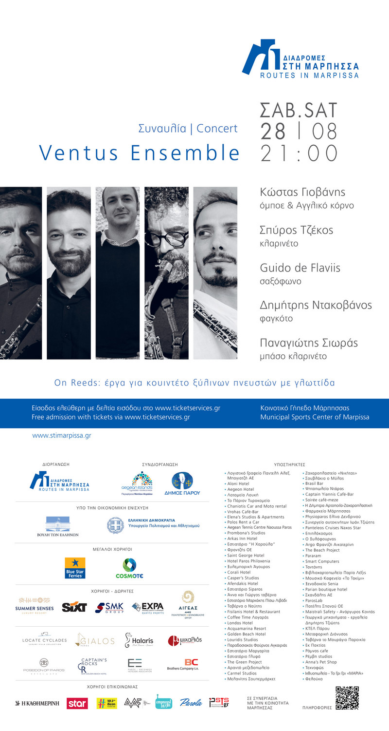 Πέντε σολίστ του Ventus Ensemble εξερευνούν και παρουσιάζουν αγαπημένα τους έργα, φιλτραρισμένα μέσα από το ηχόχρωμα ενός νεοσύστατου είδους κουιντέτου, του Reed Quintet. Ένας όρος που άρχισε να χρησιμοποιείται ευρύτερα από την παγκόσμια μουσική κοινότητα τις τελευταίες μόλις δεκαετίες. Το κουιντέτο ξύλινων πνευστών με γλωττίδα, του συνόλου Ventus, είναι η πιο πρόσφατη και περιπετειώδης προσέγγιση του συνόλου στο ρεπερτόριο των τελευταίων αιώνων, παρουσιάζοντας ευφάνταστες μεταγραφές και πρωτότυπες συνθέσεις.