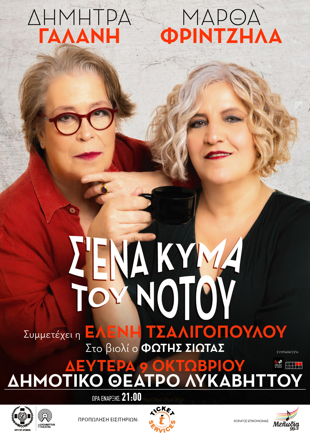 H Δήμητρα Γαλάνη και η Μάρθα Φριντζήλα τη Δευτέρα 9 Οκτωβρίου, σε συνέχεια των δύο sold out εμφανίσεών τους στο Μέγαρο Μουσικής Αθηνών, έρχονται πάνω «Σ' ένα κύμα του Νότου» στο Δημοτικό Θέατρο Λυκαβηττού για ένα ακόμα συναρπαστικό μουσικό ταξίδι, αυτή τη φορά με θέα την πόλη από ψηλά. Στο ανανεωμένο, ιστορικό ανοιχτό θέατρο, οι δύο ερμηνεύτριες υπόσχονται λίγο καλοκαίρι ακόμα και μας προσκαλούν να τραγουδήσουμε μαζί τους διαχρονικά τραγούδια και διασκευές με νέα προσέγγιση, μέσα από την πρωτότυπη ματιά των ταλαντούχων μουσικών που τις πλαισιώνουν.
