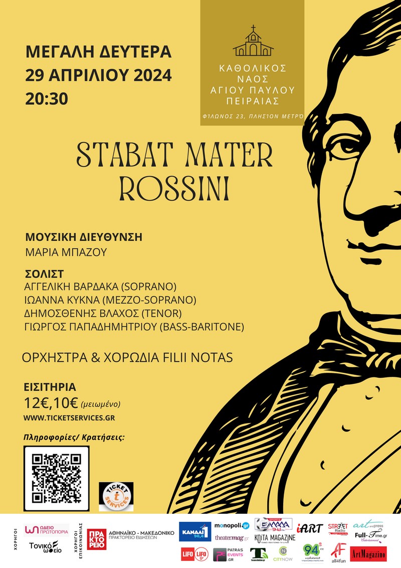 Η Μεγάλη Εβδομάδα και ο Εορτασμός για τα Θεία Πάθη ξεκινά με ένα από τα πιο εμβληματικά θρησκευτικά έργα στον Ιερό καθολικό ναό του Αγ. Παύλου στον Πειραιά, σε ένα από τα πρώτα λατρευτικά μνημεία της πόλης, θα παρουσιαστεί το έργο STABAT MATER του G. Rossini πλαισιωμένο από τέσσερις σολιστικές φωνές, ορχήστρα και χορωδία υπό τη μουσική διεύθυνση της μαέστρου Μαρίας Μπαζού.
