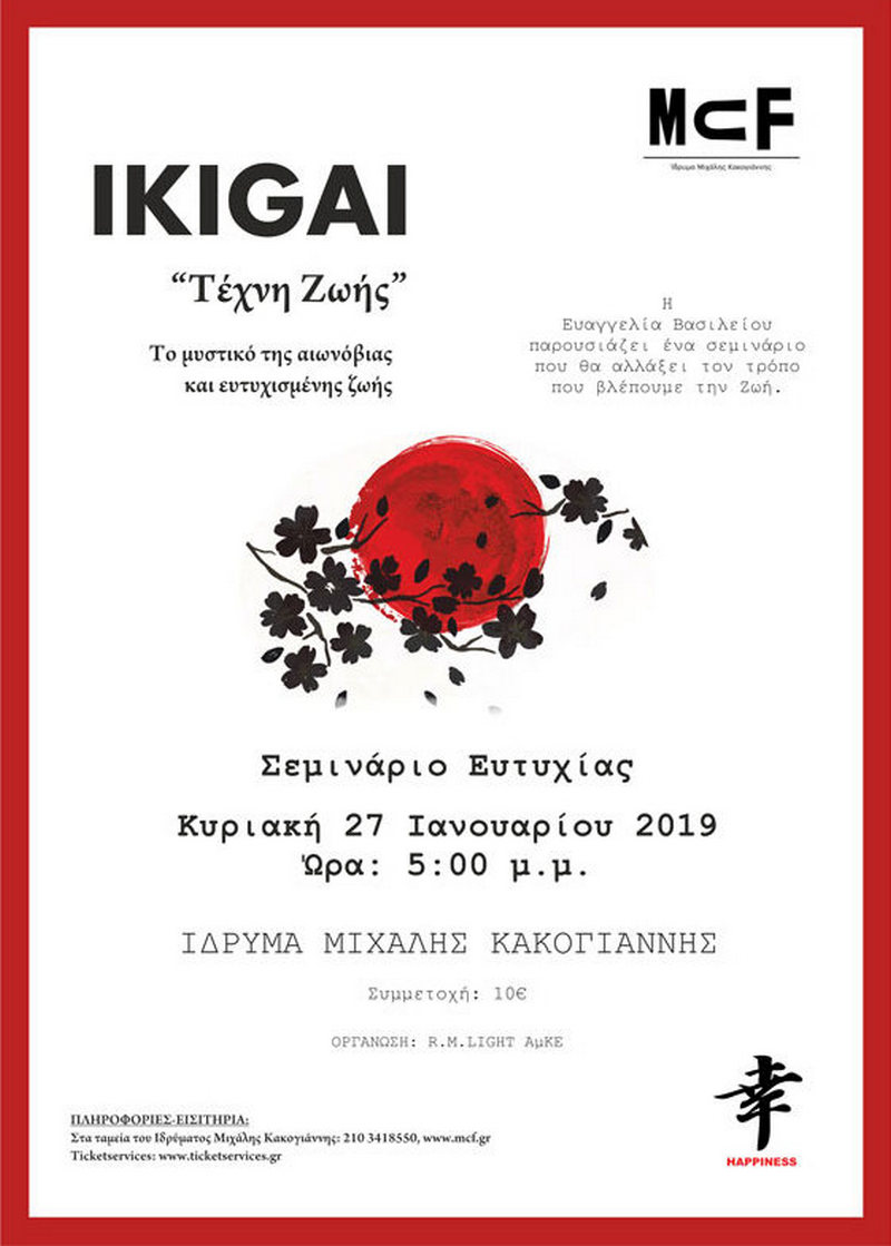 Για πρώτη φορά στην Ελλάδα παρουσιάζουμε ένα σεμινάριο για τη φιλοσοφία του IKIGAI, το μυστικό της αιωνόβιας και ευτυχισμένης ζωής που έρχεται από την Ιαπωνία για να κάνει τη ζωή μας πιο ποιοτική, πιο ουσιαστική, γεμάτη νόημα και ευτυχία. Δεν είναι μια θεωρητική μόνο πλατφόρμα αλλά είναι ένας τρόπος που μπορεί να γίνει πράξη και να αλλάξει τη ζωή σου, όπως άλλαξε και τη δική μου ζωή.