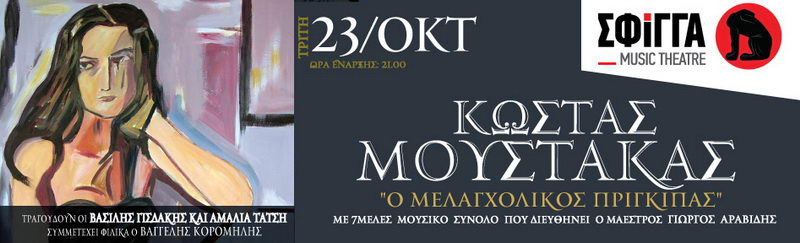 Ο Κώστας Μουστάκας και το μουσικό του σύνολο θα παρουσιάσει, την Τρίτη 23 Οκτωβρίου, στη μουσική σκηνή Σφίγγα, ορχηστρική μουσική και τραγούδια από το έργο του "Ο μελαγχολικός πρίγκιπας" σε ημικλασική και έντεχνη φόρμα. Τραγουδούν οι Βασίλης Γισδάκης και Αμαλία Τάτση. Συμμετέχει φιλικά ο Βαγγέλης Κορομήλης.