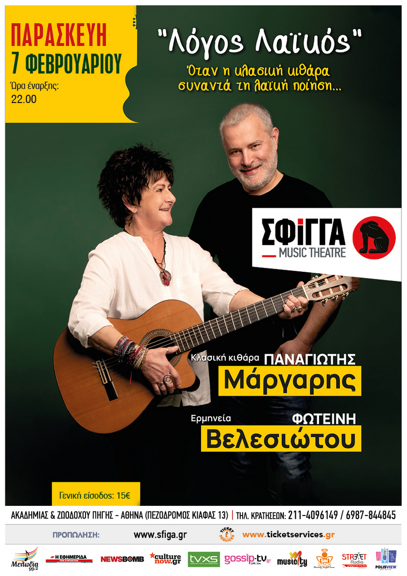 Ο βιρτουόζος κλασικός κιθαρίστας και συνθέτης Παναγιώτης Μάργαρης και η πηγαία ερμηνεύτρια Φωτεινή Βελεσιώτου μας παρουσιάζουν την Παρασκευή 7 Φεβρουαρίου στη Σφίγγα, τα παντοτινά διαμάντια του Μούτση, του Βίρβου, του Καλδάρα, του Γκάτσου, του Ξαρχάκου, του Ρασούλη και όχι μόνο.
