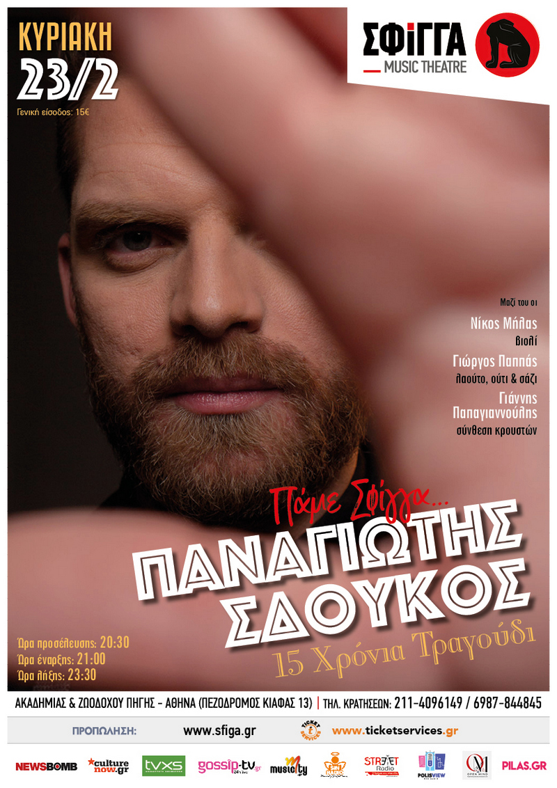 Την Κυριακή 23 Φεβρουαρίου, η Σφίγγα υποδέχεται τον Παναγιώτη Σδούκο, ο οποίος φέτος γιορτάζει τα 15 χρόνια δημιουργικής παρουσίας του στην ερμηνεία, τη διδασκαλία και την έρευνα του δημοτικού τραγουδιού.