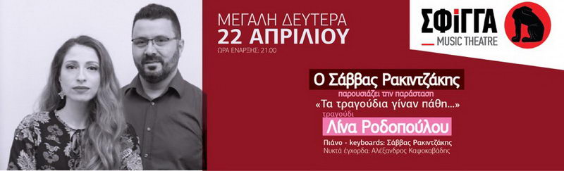 Ο Σάββας Ρακιντζάκης στο πιάνο και την επιμέλεια του προγράμματος παρουσιάζει την παράσταση «Τα τραγούδια γίναν πάθη». Μαζί του στο τραγούδι η Λίνα Ροδοπούλου.