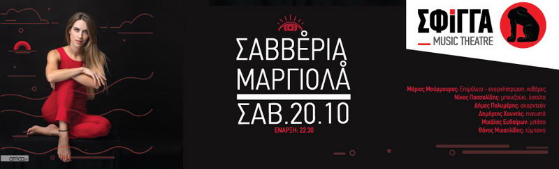 Η Σαββέρια Μαργιολά, μαζί με την εξαμελή μπάντα της, καλωσορίζει το χειμώνα στη Σφίγγα το Σάββατο 20 Οκτωβρίου. Μετά από μια γεμάτη καλοκαιρινή περιοδεία επιστρέφει ανανεωμένη, σχεδιάζοντας ένα νέο πρόγραμμα με μεγάλη ένταση, συναίσθημα και αντιθέσεις που την κάνουν να ξεδιπλώνει το δυναμισμό και τη μοναδική της ενέργεια πάνω στη σκηνή.