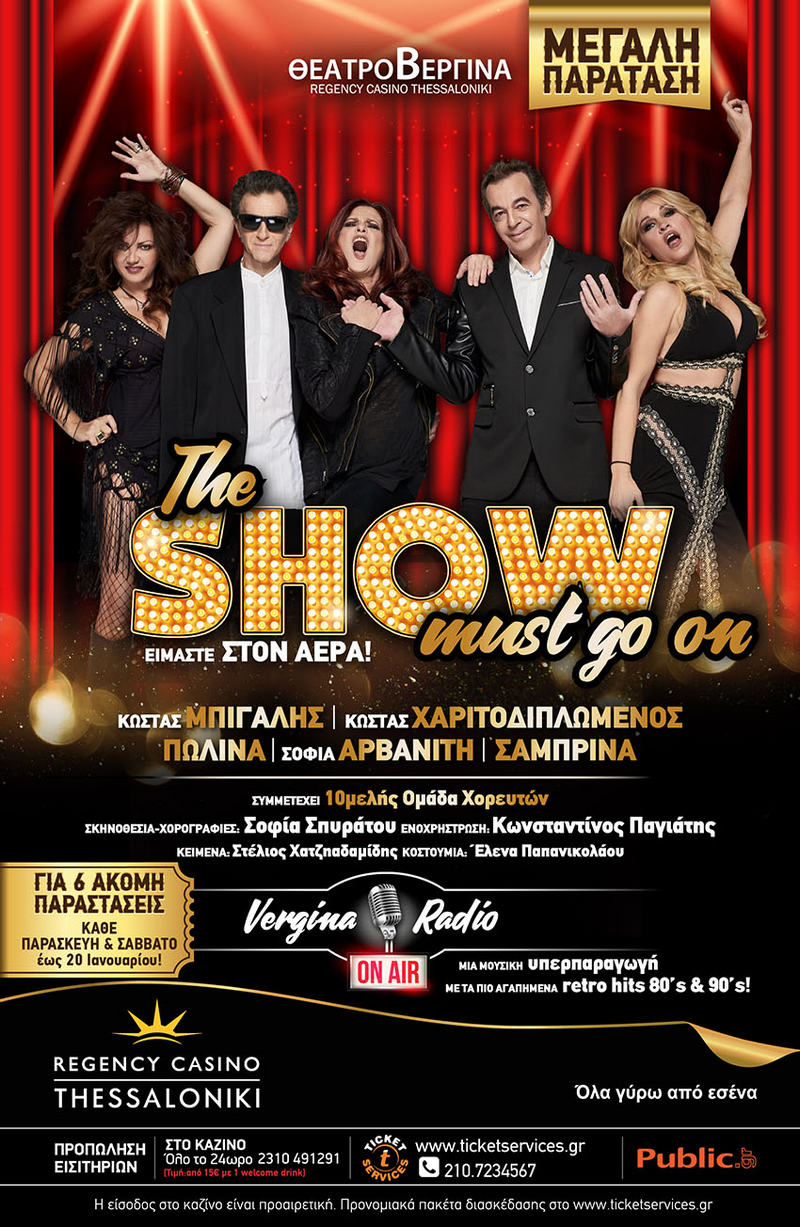 The Show Must Go On γιατί οι αγαπημένοι Κώστας Χαριτοδιπλωμένος, Κώστας Μπίγαλης, Πωλίνα, Σαμπρίνα & Σοφία Αρβανίτη φέρνουν τα 80s & 90s στους δρόμους της Θεσσαλονίκης και κάνουν το Θέατρο Βεργίνα να χορεύει στους ρυθμούς αξέχαστων τραγουδιών.
